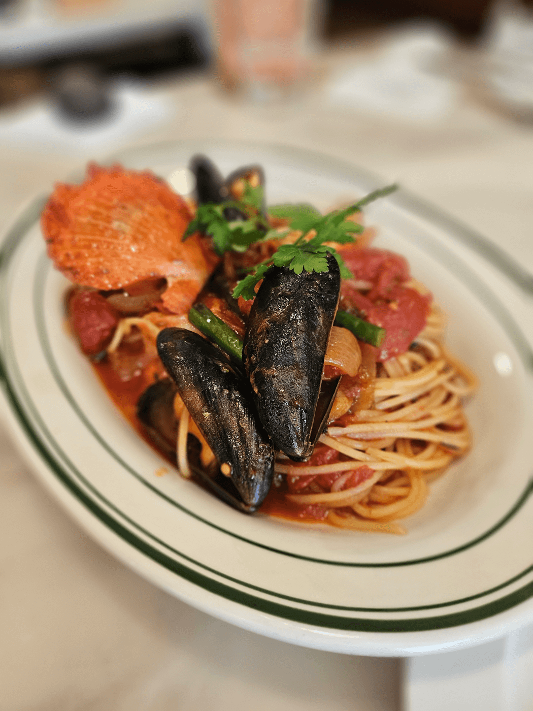 오징어, 새우, 홍합, 조개등 다양한 해산물이 가득한 토마토 스파게티입니다.