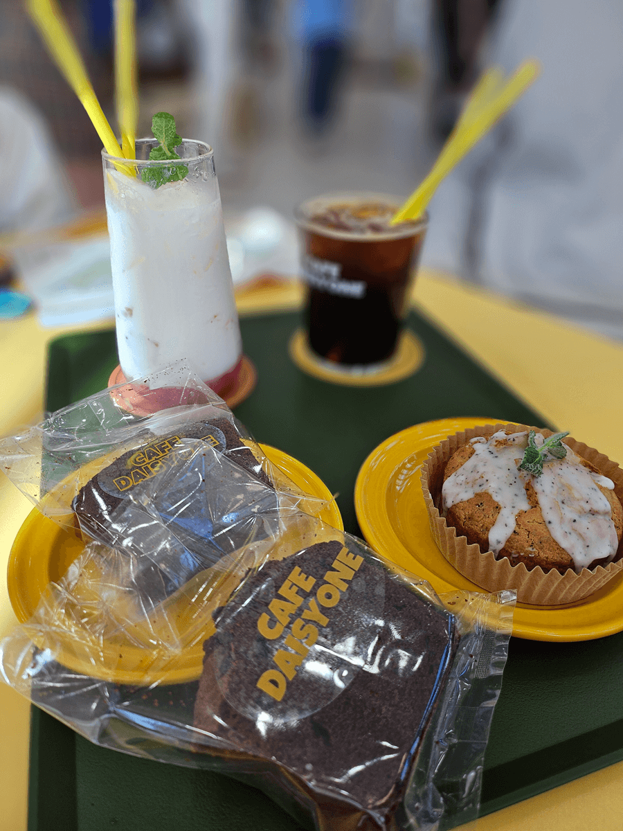 카페 컨셉이 데이지꽃이랑 어울리는 노란색인지, 로고, 스트로, 컵받침 등 노란색으로 되어있습니다.